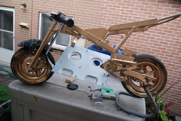 While it used to run up to 70MPH, this pocketbike has been converted into a fully-functional computer workstation. Of course, that doesn’t mean it’s not fast. Under the hood of this stellar casemod is a speedy Core i7 920 CPU on an Asus P6T mobo, with an EVGA 9800 GTX+ graphics card, 1TB of storage and 3GB of DDR3-1333 RAM. Saibot finished off his computer minibike with 5 bright CCFLs, 1 LED spot light and a pair of neon under-car lights to give it a serious glow.