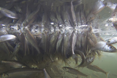 Fish cluster at an ice hole, covered with thin pieces of ice, struggling for air in a pond in a park in St. Petersburg, Russia. As the long Russian winter drags on, fish in the ponds of St. Petersburg become increasingly desperate for oxygen, clustering in vast, thrashing masses at shrinking holes in the ice. Not only does ice block oxygen that could be diffused into the water from the air, but it also impedes sunlight from reaching oxygen-generating plants and algae in the water.